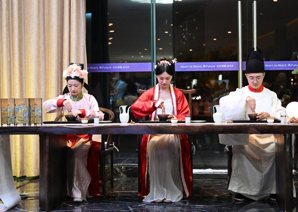 工作人员在亚奥理事会大家庭总部饭店活动现场展示点茶技艺。新华社记者 陈晔华 摄