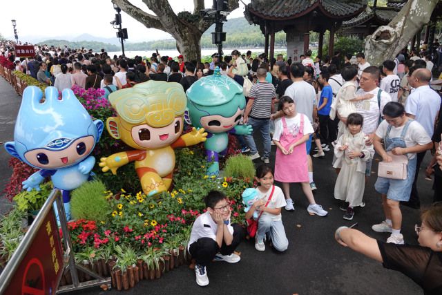 中秋国庆假期,西湖景区游客如潮,随处可见的亚运吉祥物成了大家最爱的合影对象。记者 李忠 摄