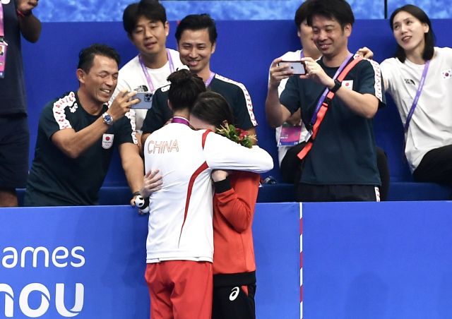 2023年9月29日,张雨霏在女子50米蝶泳决赛中夺冠。颁奖仪式上,张雨霏与获得季军、从白血病中康复的日本选手池江璃花子相拥而泣、鼓励互勉,感动万千观众。记者 王川 摄