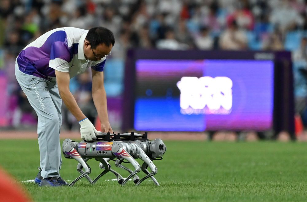 10月1日,在杭州亚运会田径女子铁饼决赛前,一名工作人员将铁饼放在用来搬运铁饼的机器狗上。新华社记者 江汉 摄
