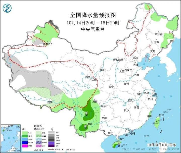 13日20时至14日20时,黑龙江西北部、新疆西部山区、西藏东部、四川盆地南部、川西高原等地部分地区有小到中雪或雨夹雪,局地有大雪。四川南部、云南、贵州、广西西北部、海南岛、台湾岛等地部分地区有小到中雨,局地有大雨。