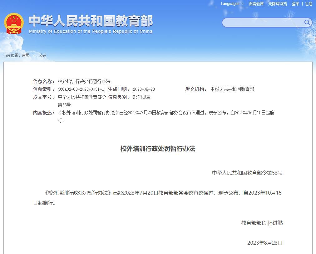 教育部日前颁布的《校外培训行政处罚暂行办法》(以下简称《办法》)自2023年10月15日起施行。《办法》明确中小学在职教师参与学科类校外培训的将依法从重处罚。