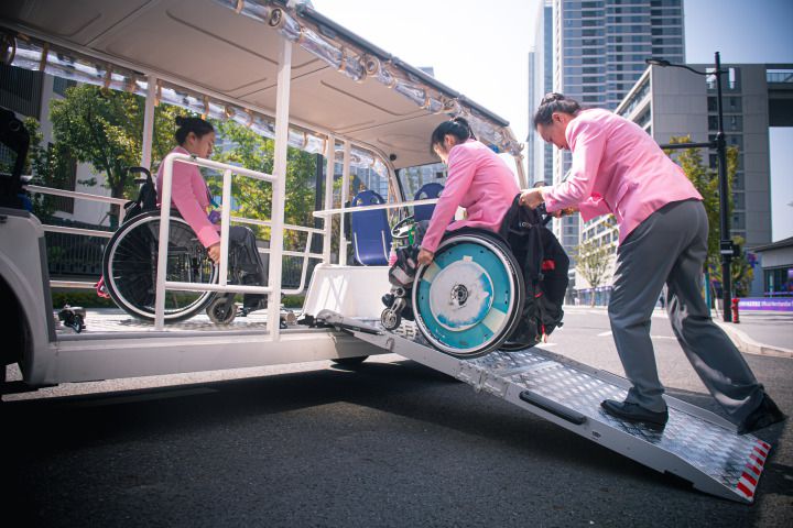 10月16日,中国体育代表团成员在杭州亚残运村内乘坐无障碍接驳车出行。图源新华社