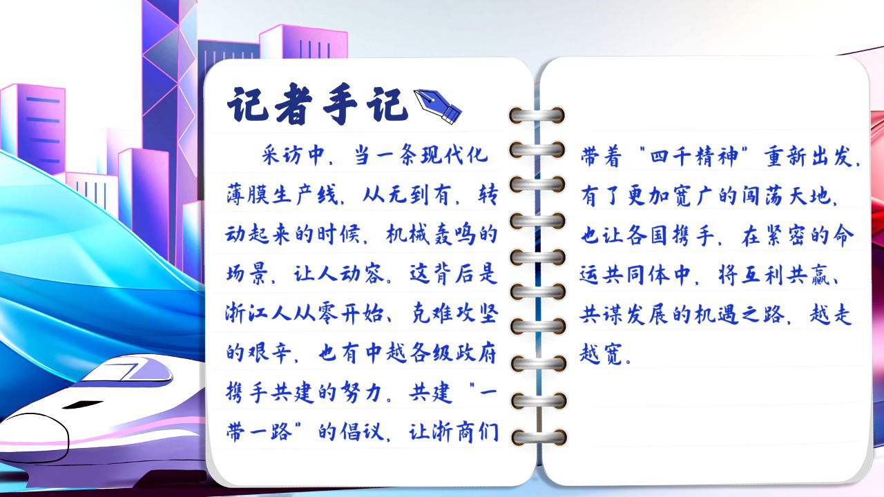 记者手记:采访中,当一条现代化薄膜生产线,从无到有,转动起来的时候,机械轰鸣的场景,让人动容。这背后是浙江人从零开始、克难攻坚的艰辛,也有中越各级政府携手共建的努力。共建“一带一路”的倡议,让浙商们带着“四千精神”重新出发,有了更加宽广的闯荡天地,也让各国携手,在紧密的命运共同体中,将互利共赢、共谋发展的机遇之路,越走越宽。请继续关注《筑梦丝路·“海丝”路上乘风破浪》。
