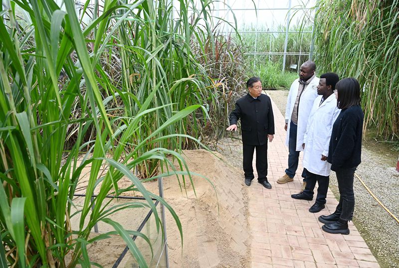 2021年11月23日,林占熺(左一)在国家菌草工程技术研究中心菌草种质资源圃给外国留学生(左二、左三)讲解菌草的种植培育技术。