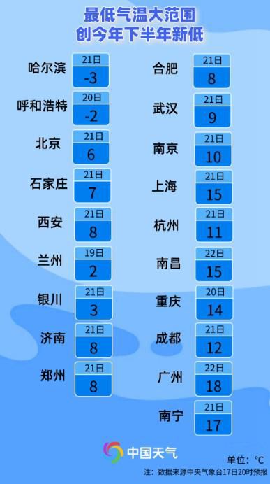 中东部地区最低气温的低点大多在20—21日,从黑龙江到广东、广西,大部地区最低气温都有可能创下今年立秋以来的新低,迎来最凉早晨。