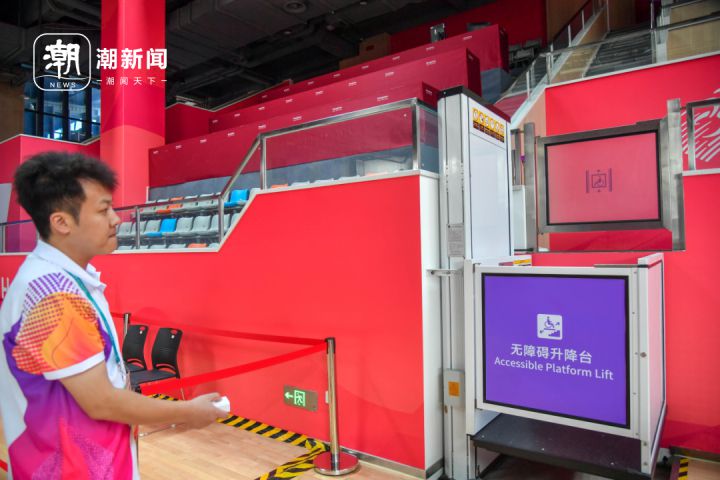 位于杭州临平塘栖的国家盲人门球训练基地里的无障碍静音升降机,可以为坐轮椅的残疾人上下看台提供方便。记者 董旭明 摄