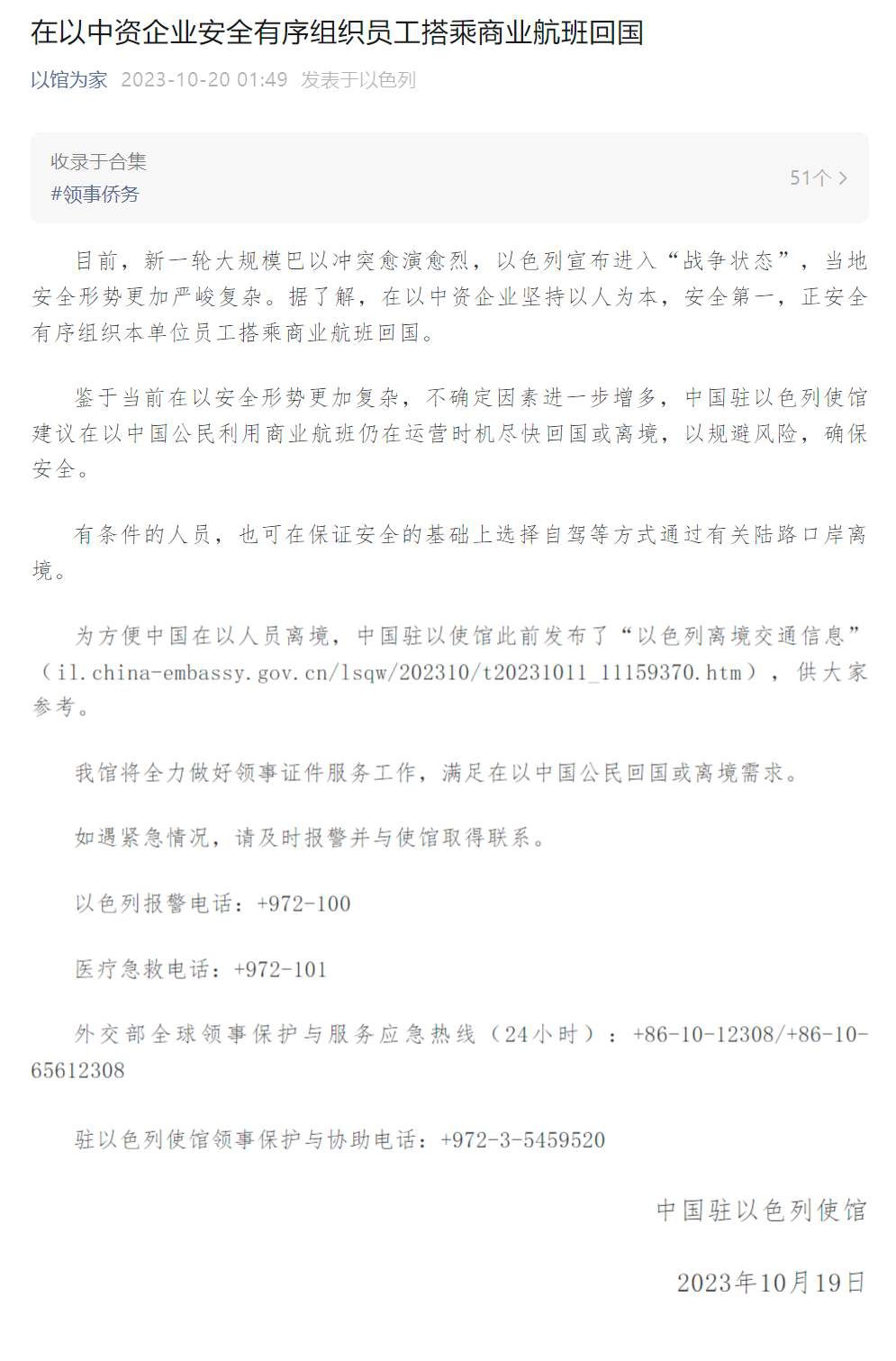 2023年10月19日,中国驻以色列使馆发布《在以中资企业安全有序组织员工搭乘商业航班回国》,全文如下:
