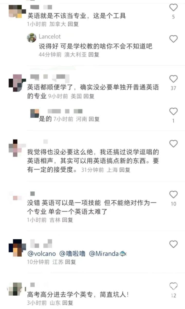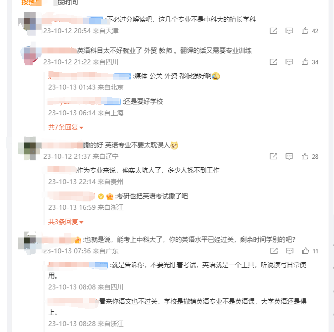 消息发出后,网友讨论热烈,尤其是针对英语专业的撤销与否。有人认为英语专业没必要撤、可以努力创新,有人认为英语专业就业前景大不如前,不该再作为专业,也有人认为中科大在专业设置上回到“科技”这一本源上挺好的,不必追求大而全。