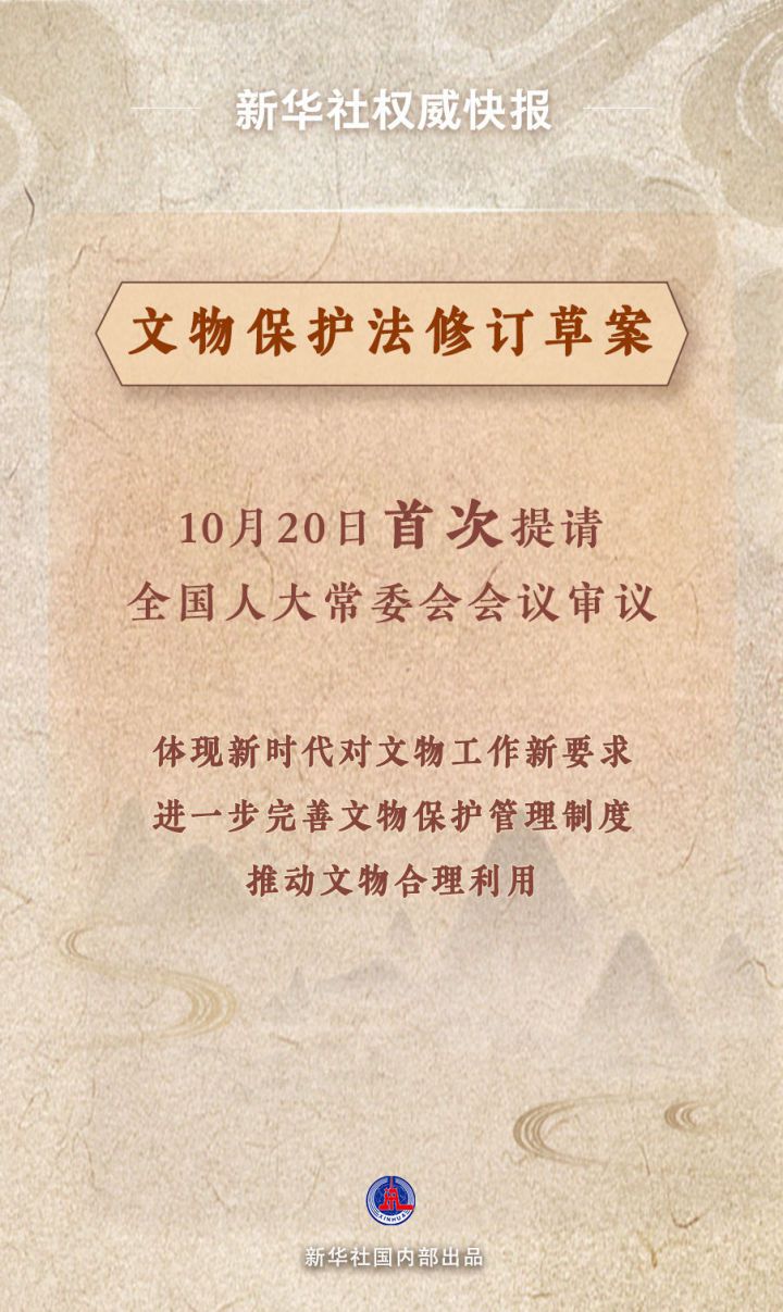 10月20日,文物保护法修订草案提请十四届全国人大常委会第六次会议首次审议。修订草案贯彻党中央决策部署,体现新时代对文物工作新要求;坚持把保护放在第一位,进一步完善文物保护管理制度;妥善处理保护和利用的关系,推动文物合理利用;多措并举加大处罚力度,严厉打击破坏文物违法行为。