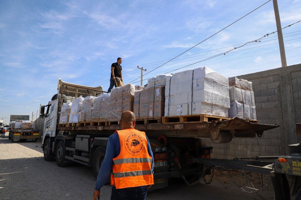 10月21日,工作人员在加沙地带南部城市拉法卸货。新华社发(里泽克·阿卜杜勒贾瓦德摄)