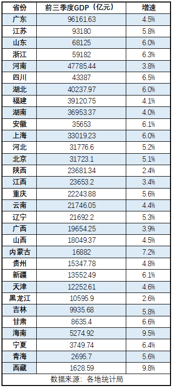 从GDP增速看,31个省区市中,有17个省区市前三季度GDP增速快于全国水平,依次为西藏(9.8%)、海南(9.5%)、内蒙古(7.2%)、甘肃(6.6%)、四川(6.5%)、宁夏(6.4%)、浙江(6.3%)、安徽(6.1%)、新疆(6.1%)、山东(6.0%)、湖北(6.0%)、上海(6.0%)、江苏(5.8%)、吉林(5.8%)、重庆(5.6%)、青海(5.6%)、辽宁(5.3%);河北(5.2%)增速与全国持平。