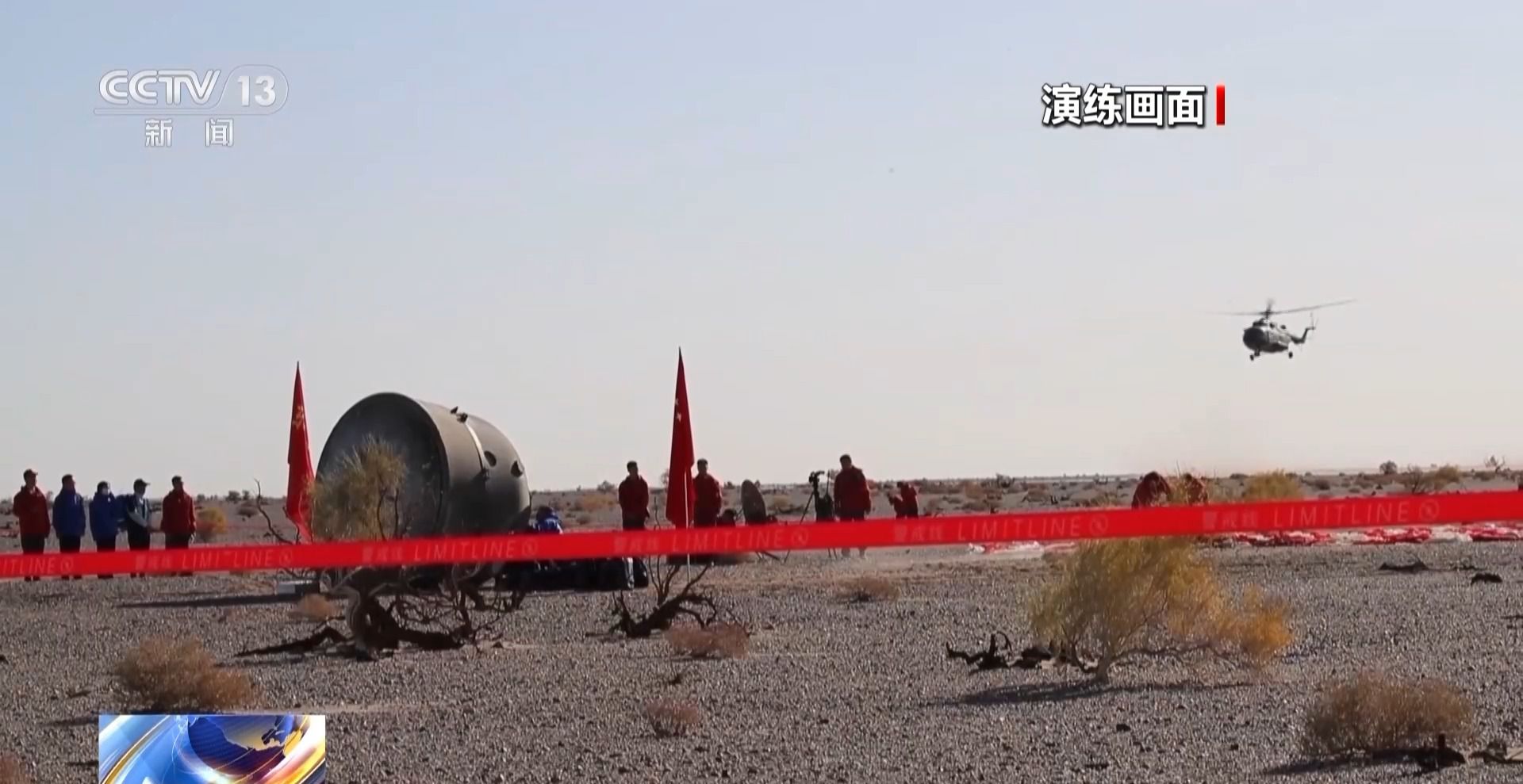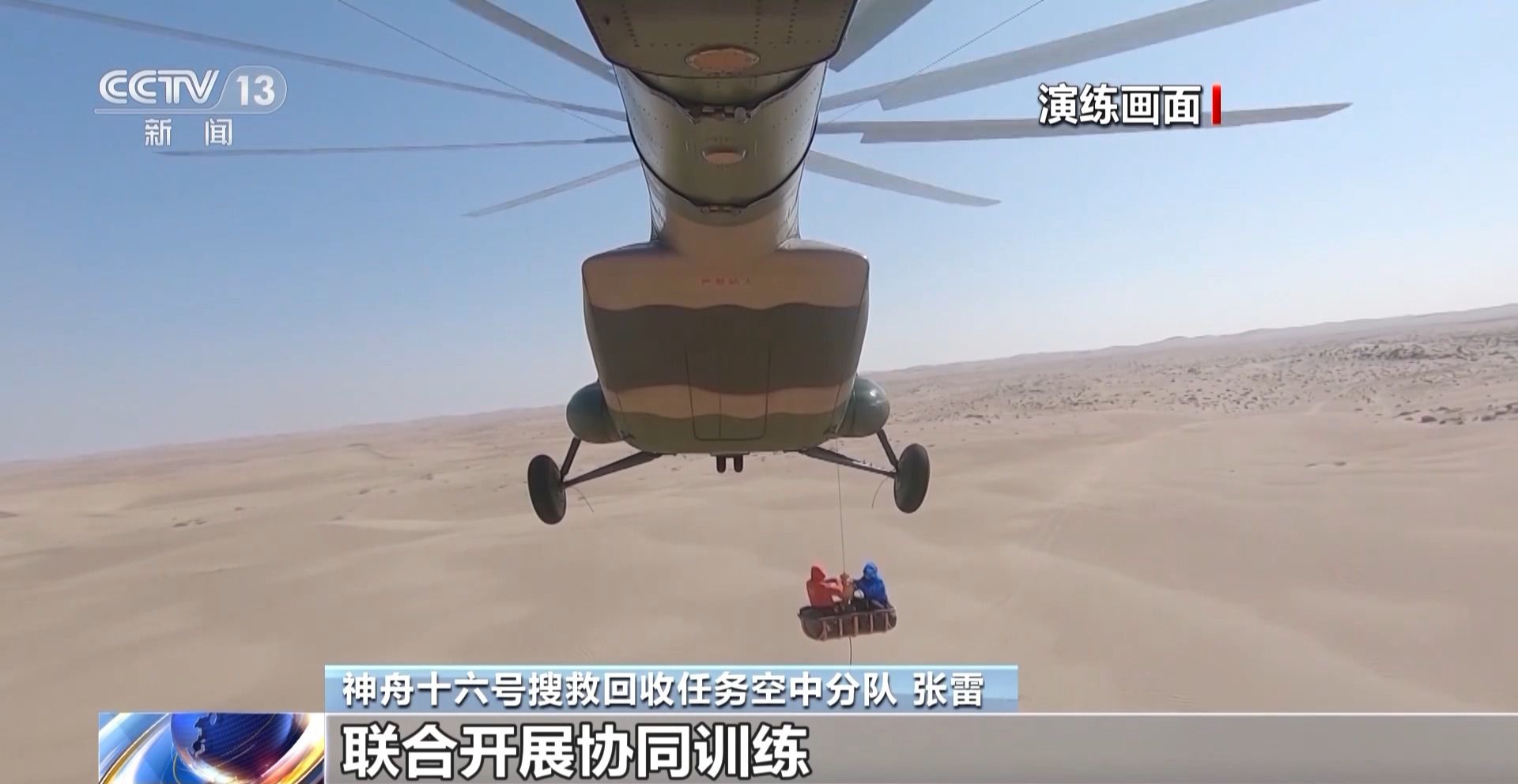 神舟十六号搜救回收任务空中分队 张雷:到这以后我们主要开展了三个阶段的训练,第一个阶段是我们本级的自行训练,结合这个场地的勘察,对整个着陆场区的高大障碍物和地形进行了详细的勘察和标定。同时我们利用这个训练的过程,组织了夜航的训练和吊篮训练。第二个阶段和其他的搜救兄弟单位联合开展协同训练。最后我们参加了两次的全要素演练。