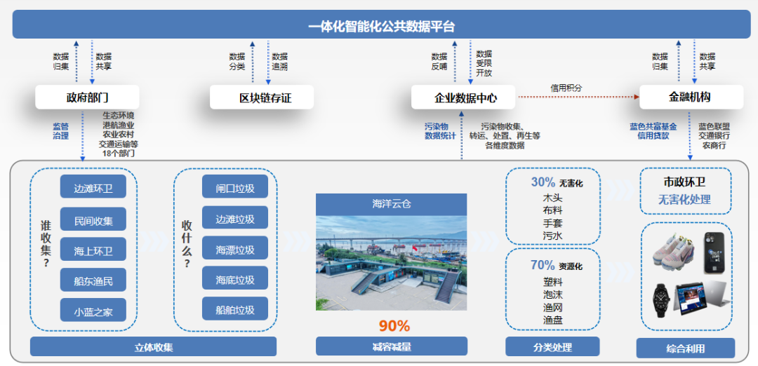 构建实体化运作的收集体系。对海洋塑料在源头进行控制,设置“小蓝之家”海洋垃圾收集点,组织发动渔船渔民、沿海群众有效收集。通过数字化分质分流,30%的不可再生垃圾进入环卫系统,70%的可再生垃圾进行市场化回收。整个垃圾收集处置构成全流程可视化闭环体系。