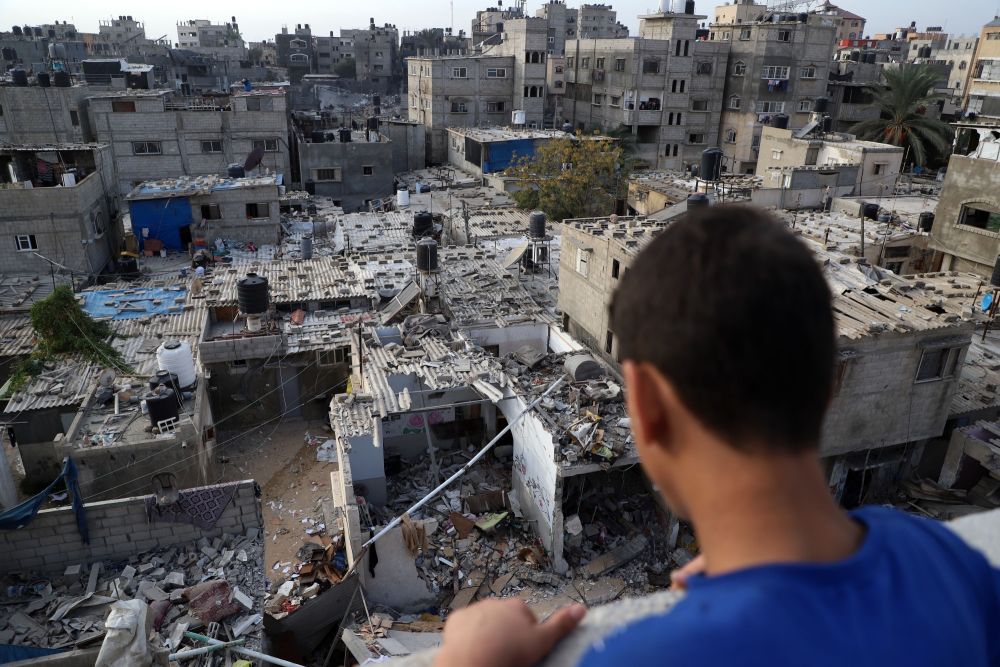 10月29日,在加沙地带南部城市汗尤尼斯,一名儿童看向遭以色列袭击损毁的建筑。新华社发(里泽克·阿卜杜勒贾瓦德摄)