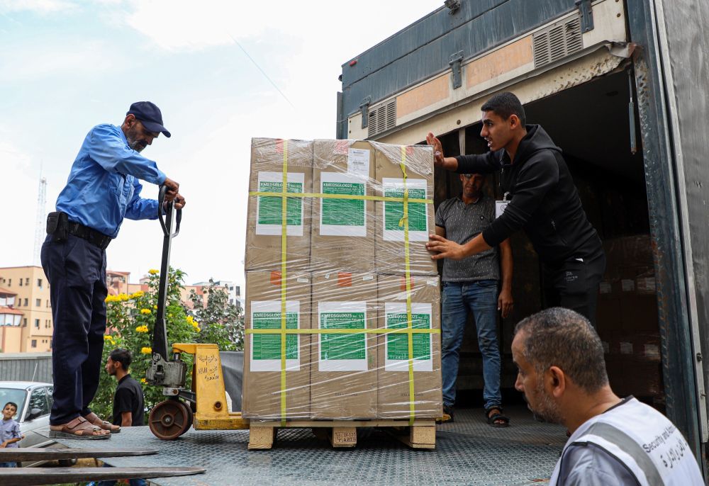 10月29日,工作人员在加沙地带南部城市汗尤尼斯的一家医院搬运医疗援助物资。新华社发(里泽克·阿卜杜勒贾瓦德摄)