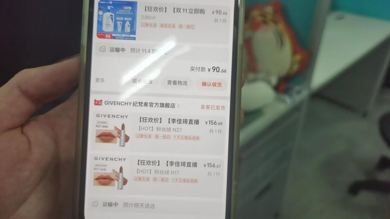 她向记者晒出了自己的购物清单,“也就是给孩子买了买衣服,买了一些平常要用的化妆品,大容量的润肤露,洗发水、精华……往年要囤的海外品牌的化妆品也换成了国货品牌,一定要说的话,在李佳琦直播间买了两只纪梵希的口红算是促销节点期间给自己的额外奖励。”