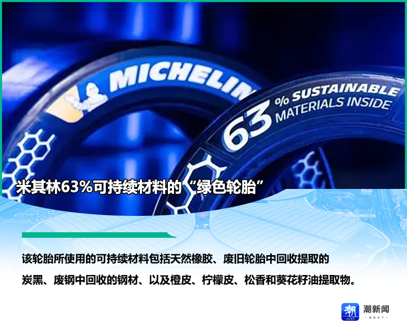 米其林将会带着一款63%可持续材料的“绿色轮胎”亮相进博会,这也是该款轮胎在亚洲的首次亮相。2021年,米其林在进博会上展示了46%可持续材料的轮胎。2022年,米其林又发布了53%可持续材料的轮胎。这次又有新的突破——63%可持续材料轮胎。目标到2050年,所有轮胎都将100%使用生物基、可再生及可回收的可持续材料生产。