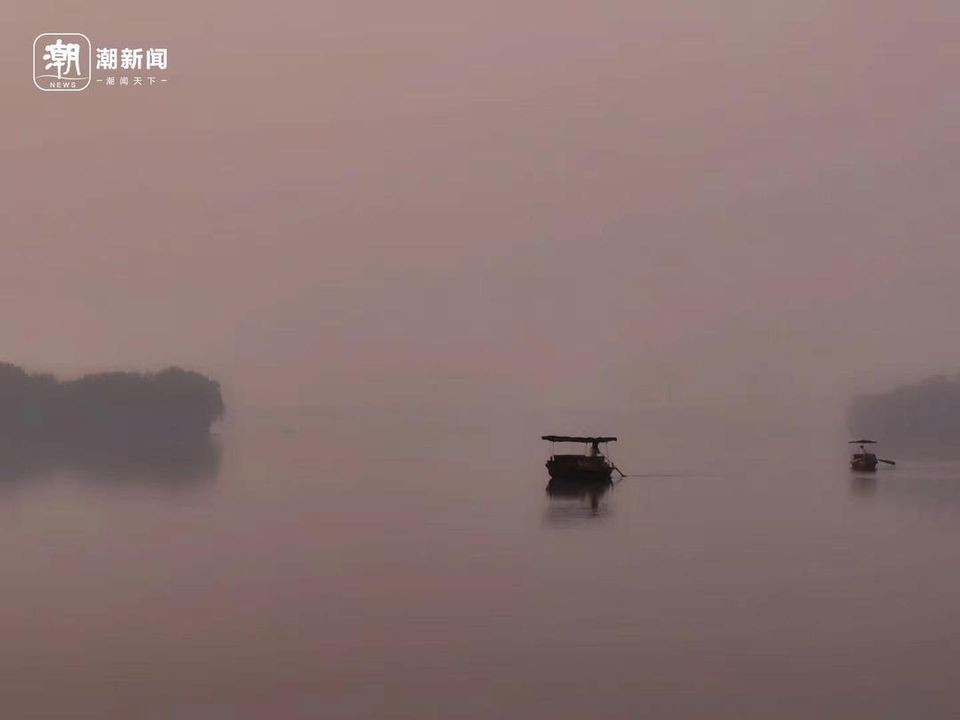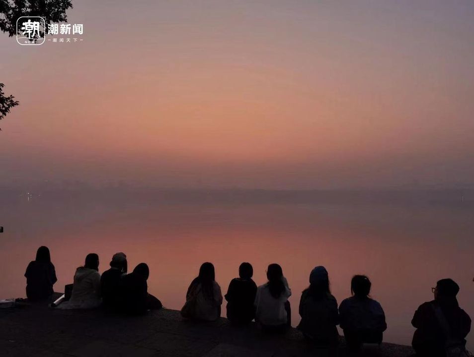今天一大早的西湖边,有薄雾。早起等日出的人们不少。