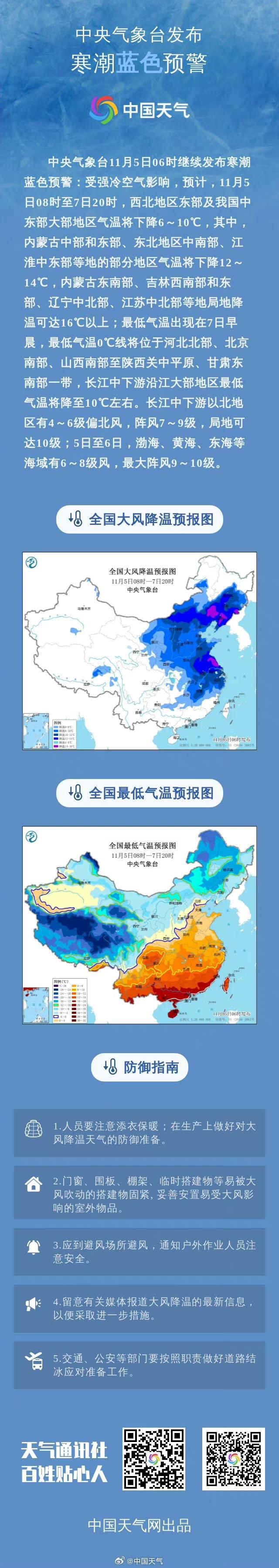 中央气象台11月5日06时继续发布寒潮蓝色预警:受强冷空气影响,预计,11月5日08时至7日20时,西北地区东部及我国中东部大部地区气温将下降6~10℃,其中,内蒙古中部和东部、东北地区中南部、江淮中东部等地的部分地区气温将下降12~14℃,内蒙古东南部、吉林西南部和东部、辽宁中北部、江苏中北部等地局地降温可达16℃以上;最低气温出现在7日早晨,最低气温0℃线将位于河北北部、北京南部、山西南部至陕西关中平原、甘肃东南部一带,长江中下游沿江大部地区最低气温将降至10℃左右。长江中下游以北地区有4~6级偏北风,阵风7~9级,局地可达10级;5日至6日,渤海、黄海、东海等海域有6~8级风,最大阵风9~10级。