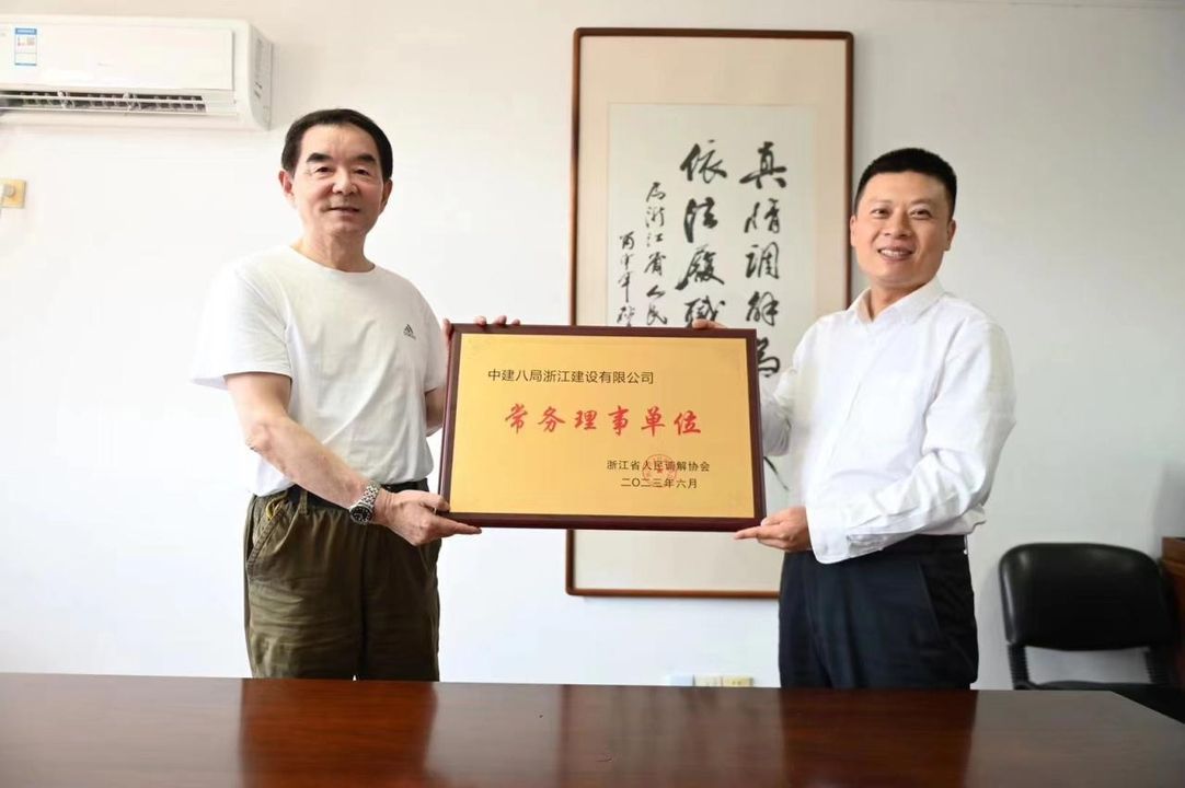 省人民调解协会会长季培军(左)为协会常务理事单位中建八局浙江建设有限公司授牌