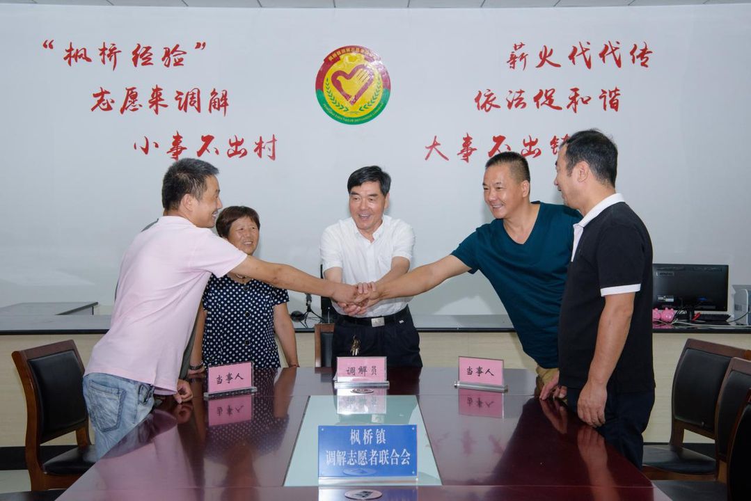 诸暨枫桥老杨调解室,在全国人民调解专家杨光照(中)的调解下,当事人握手言和