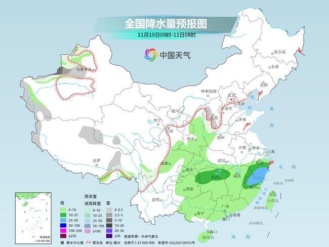 后天,新疆沿天山地区和南疆西部山区、山西中部等地部分地区有小到中雪或雨夹雪,局地大雪。西北地区东南部、江汉西部、江南、西南地区东部、华南、台湾岛等地部分地区有小到中雨,其中,浙江中南部、福建北部等地部分地区有大雨。