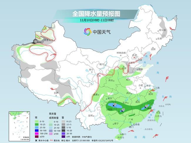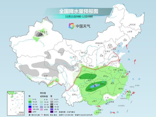 具体来看,今天,新疆西部和南疆南部、西藏西部和北部、青海南部、黑龙江东部、吉林北部、山西北部、河北南部、山东西部等地部分地区有小到中雪或雨夹雪,其中,新疆伊犁河谷和沿天山一带等地部分地区有大雪,局地暴雪(10~12毫米)。重庆东南部、贵州东部和北部、湖南中南部、江西中南部、浙江南部、福建中北部以及广西东北部等地部分地区有中雨,其中,贵州东北部、湖南西部、福建西北部等地部分地区有大雨。