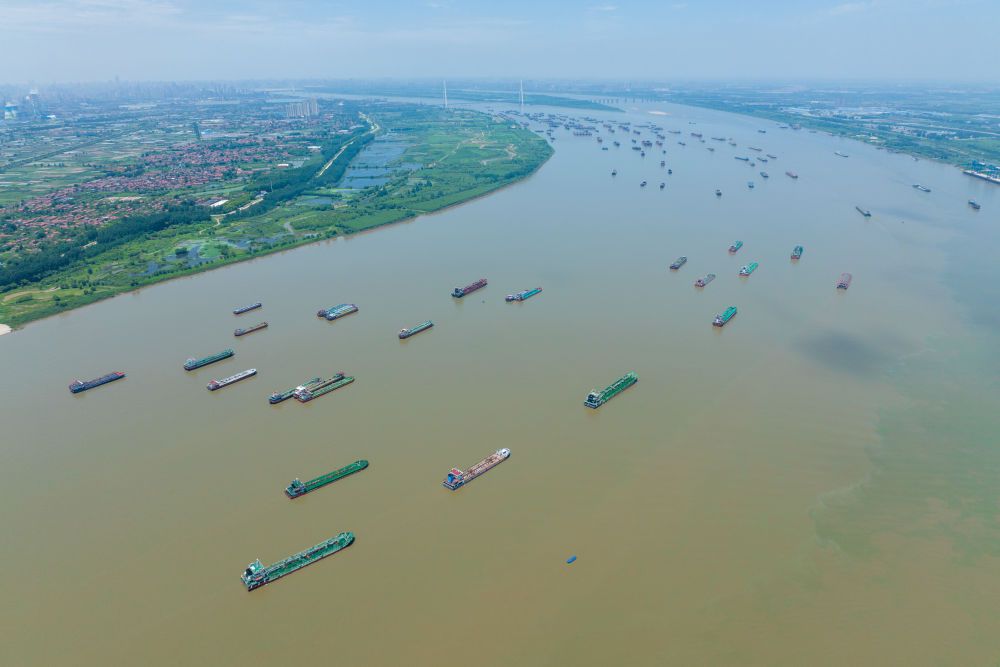 7月5日,船舶在武汉阳逻港区水域行驶(无人机照片)。新华社记者伍志尊 摄