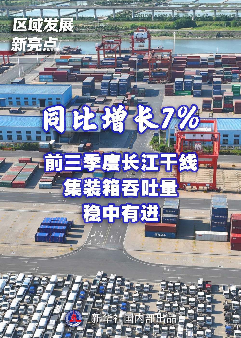 交通运输部长江航务管理局的统计数据显示,今年前三季度,长江干线港口完成货物吞吐量28.2亿吨,同比增长7.4%;集装箱吞吐量1932万标准箱,同比增长7%。