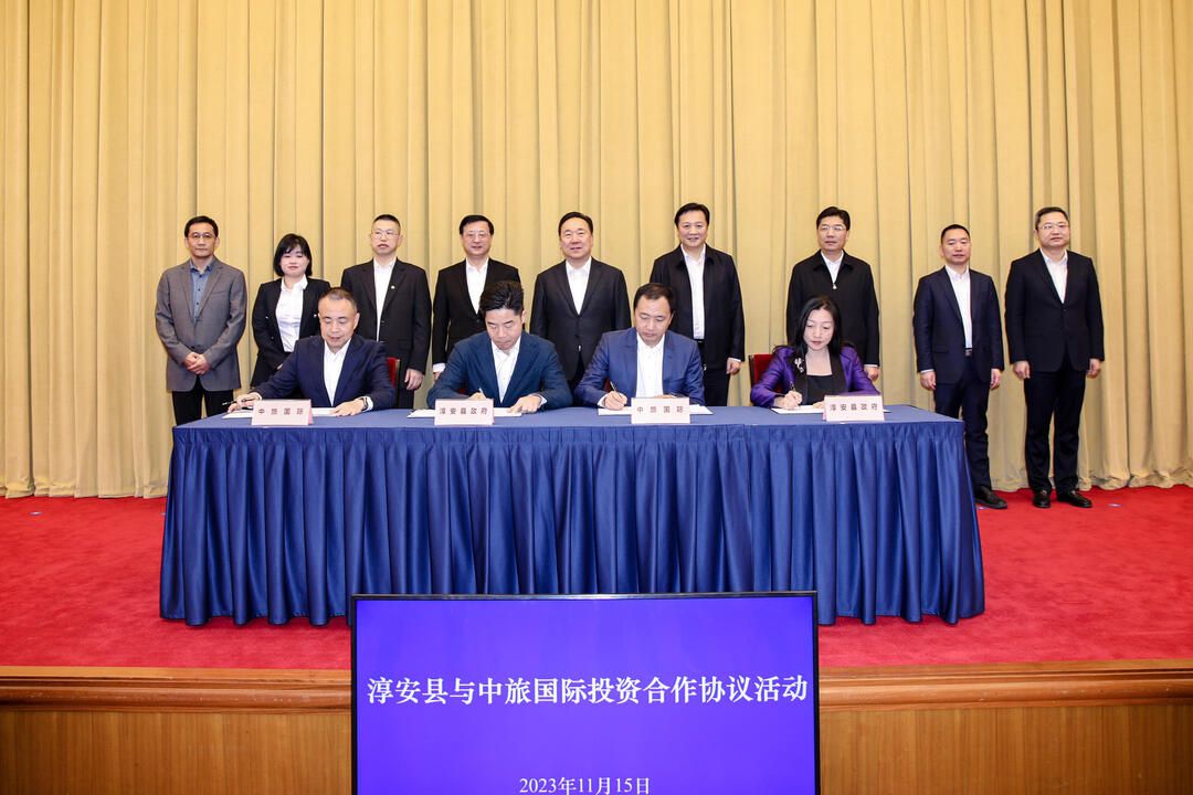 15日上午,淳安县与中旅国际签署投资合作协议,省长王浩和中旅集团董事长陈寅见证签约。