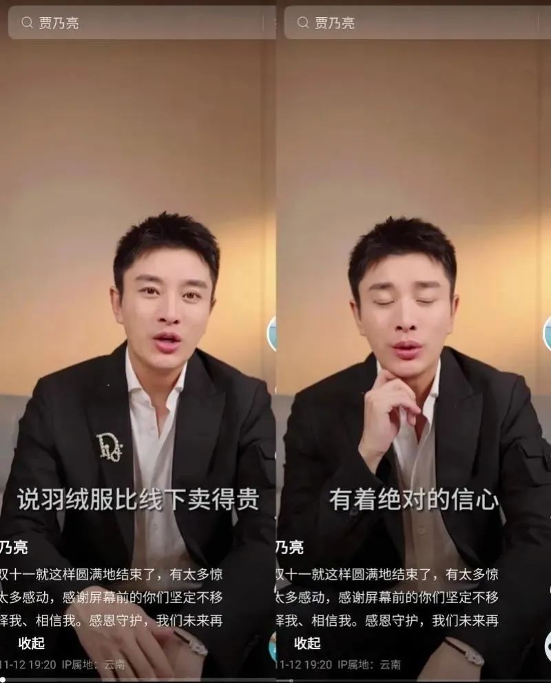 11月12日晚,贾乃亮也发视频表示:“今年‘双11’有争议,网友质疑羽绒服比线下卖得贵,但我对我的机制有着绝对的信心。”据了解,贾乃亮的直播间在今年‘双11’期间总销售额超13.6亿元,同比去年‘双11’增幅323%。