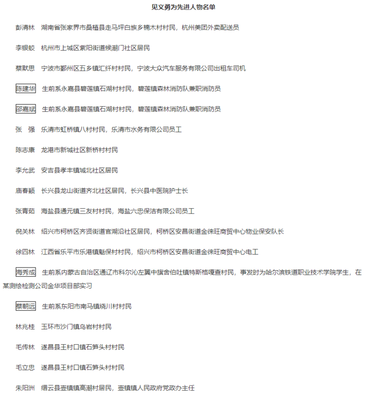记者从浙江省人民政府网站了解到:为大力弘扬社会正气,倡导见义勇为行为,激励广大人民群众与违法犯罪行为作斗争,积极参与抢险救灾,根据《浙江省见义勇为人员奖励和保障条例》《浙江省行政奖励暂行办法》,经省政府常务会议审议通过,决定为彭清林、李银蛟、蔡默思、张强、陈志康、李允武、庙春颖、张青茹、倪关林、徐四林、林兆桂、毛传林、毛立忠、朱阳洲记一等功,为陈建华、邵嘉斌、海秀成、蔡朝远追记一等功。
