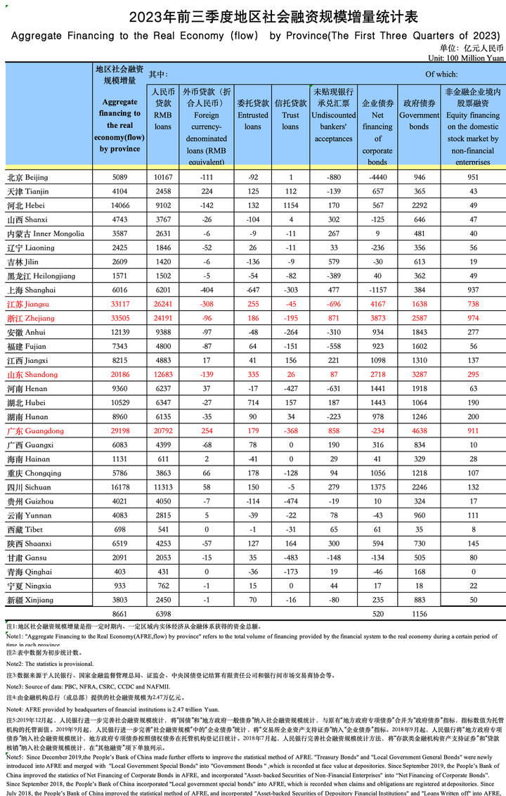 近日,央行发布2023年前三季度地区社会融资(下称“社融”)规模增量统计表。涌金君注意到,浙江、江苏、广东排名前列,其中,浙江社融规模增量为33505亿元,位居全国第一。