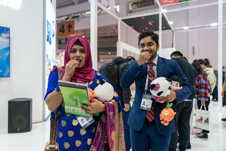 11月17日,两名来自孟加拉国的参展商在2023中国国际旅游交易会上品尝来自新疆的红枣。新华社记者 陈欣波 摄
