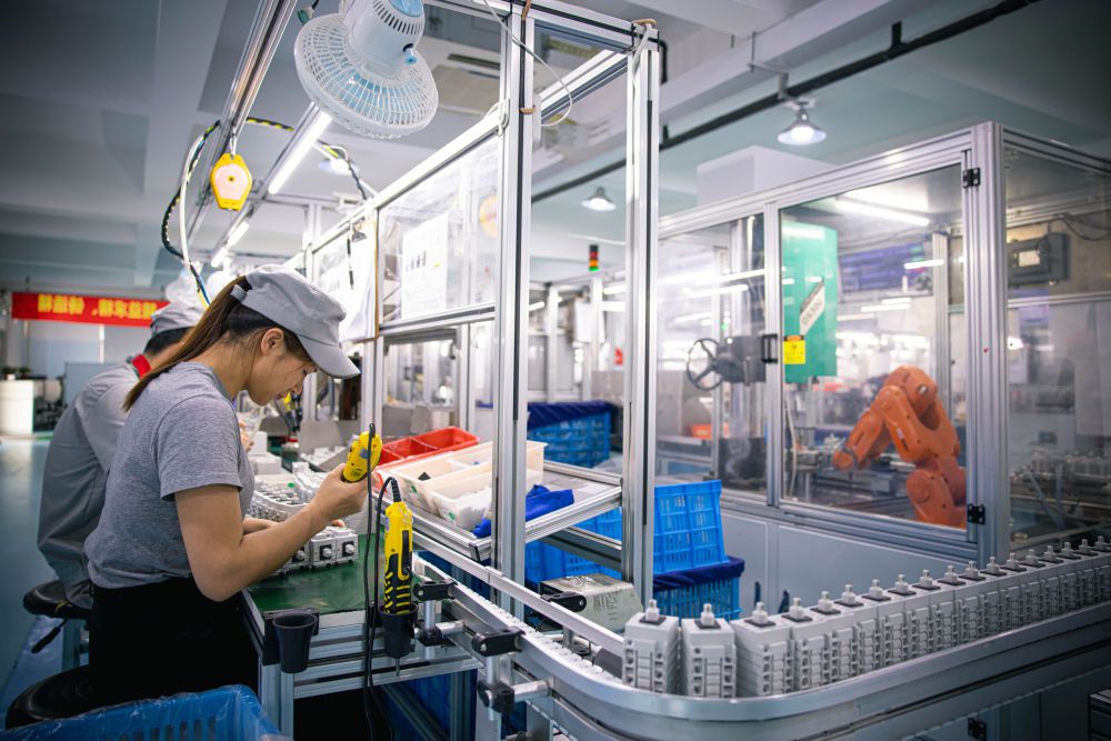 在浙江温州的奔一新能源有限公司,工人在生产线上工作。新华社记者江汉 摄