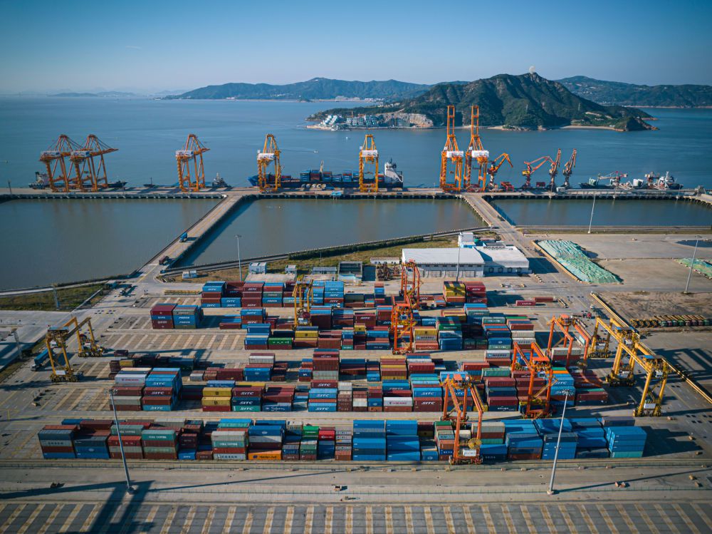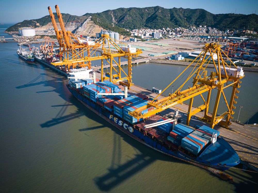 11月22日,货轮停靠在温州港集团状元岙港区集装箱码头卸载集装箱(无人机照片)。新华社记者江汉 摄