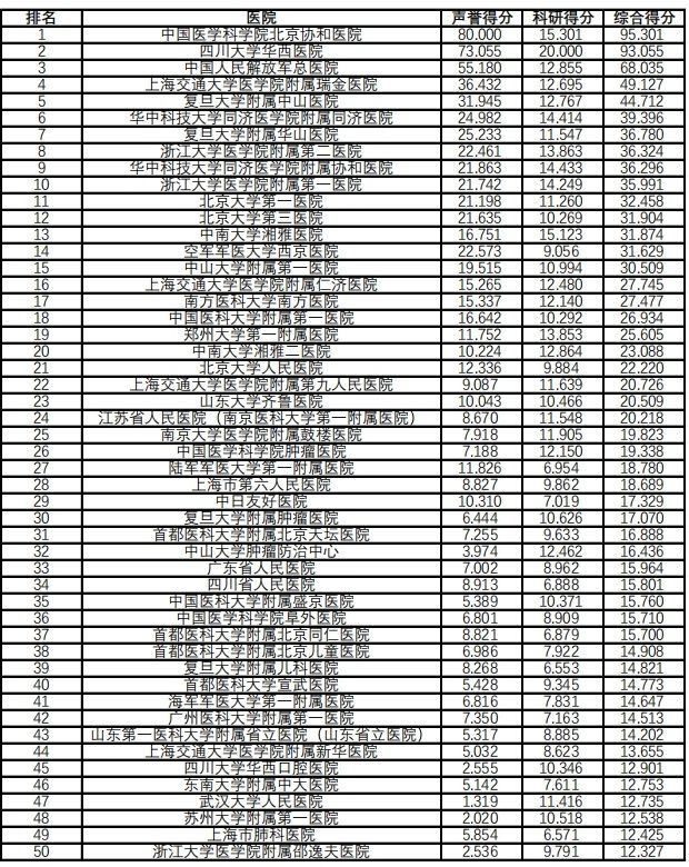 △全国医院+综合排名(前50名)