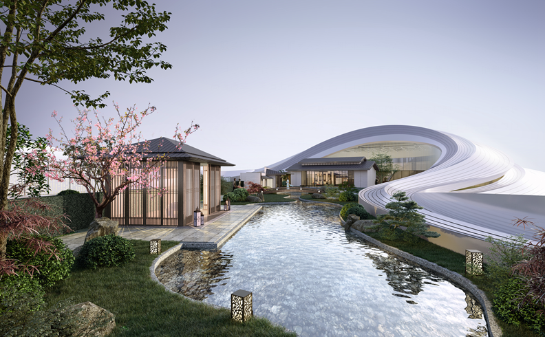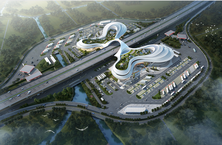 从桐乡服务区的设计可窥一二,这是一个“破茧为蝶”造型的服务区,采用立体式设计,负一层设置了两个公共停车场,地上一层为风雅桐乡十二乐章展厅及科技展厅,二层为商业用房,三层为休闲会客区,屋顶打造了临空水乡景观,营造出梦里乌镇,枕水江南的意境。