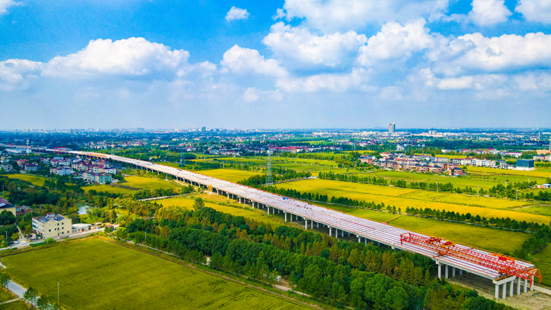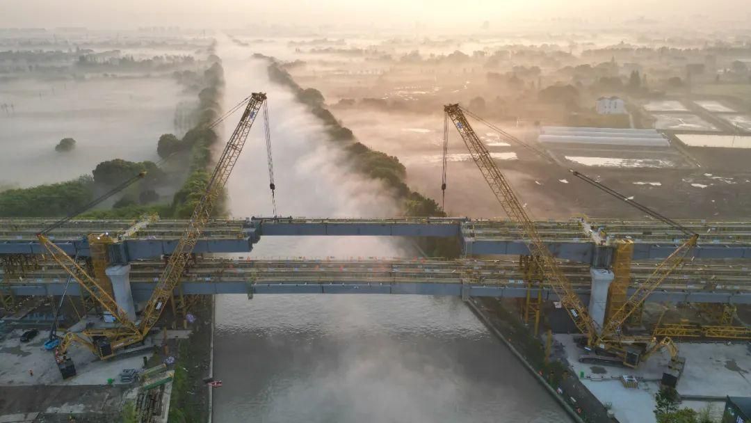 苏台铁路跨京杭古运河双层钢箱梁架设。桐乡供图
