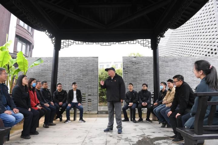 老党员在枫桥经验陈列馆的亭子内和年轻党员分享当年运用“枫桥经验”化解基层矛盾的故事。新华社记者 翁忻旸 摄