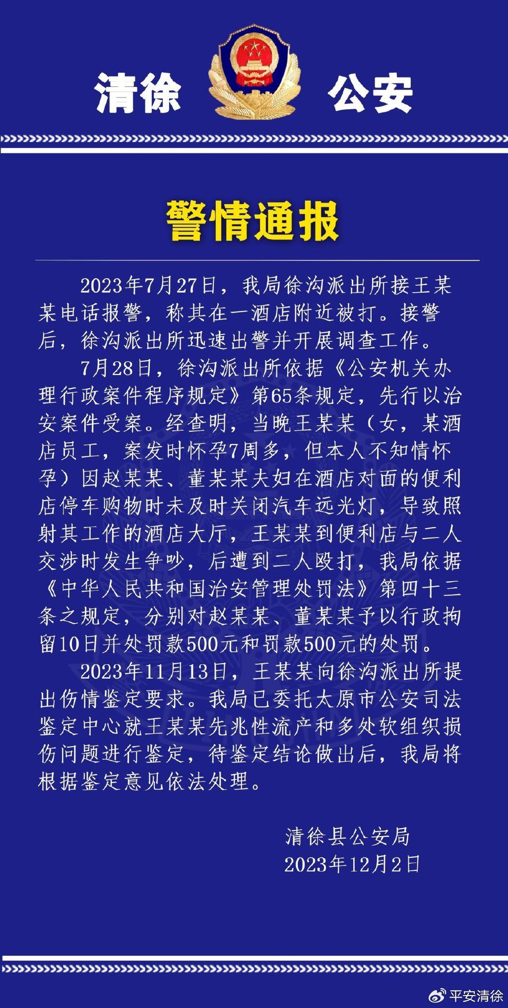 山西清徐县公安局2023年12月2日发布警情通报。