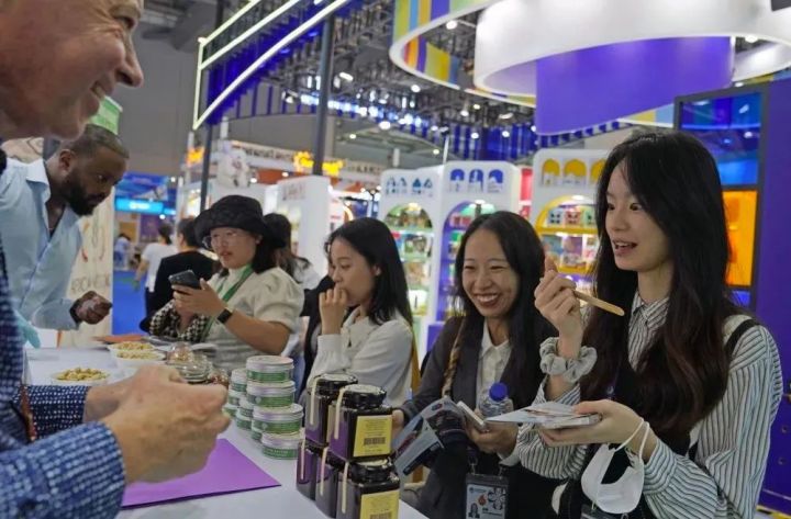 11月5日,在第六届进博会上,观众试吃蜂蜜产品 图源:新华社