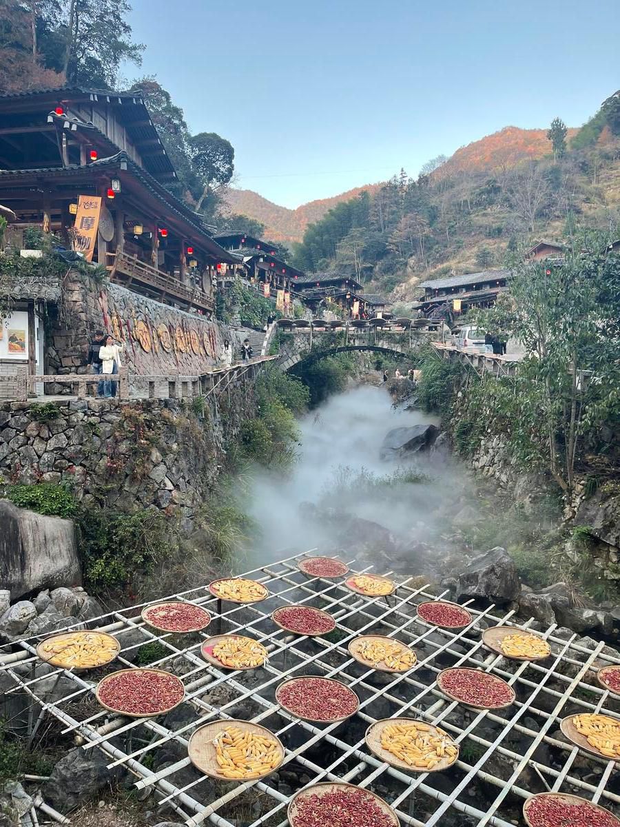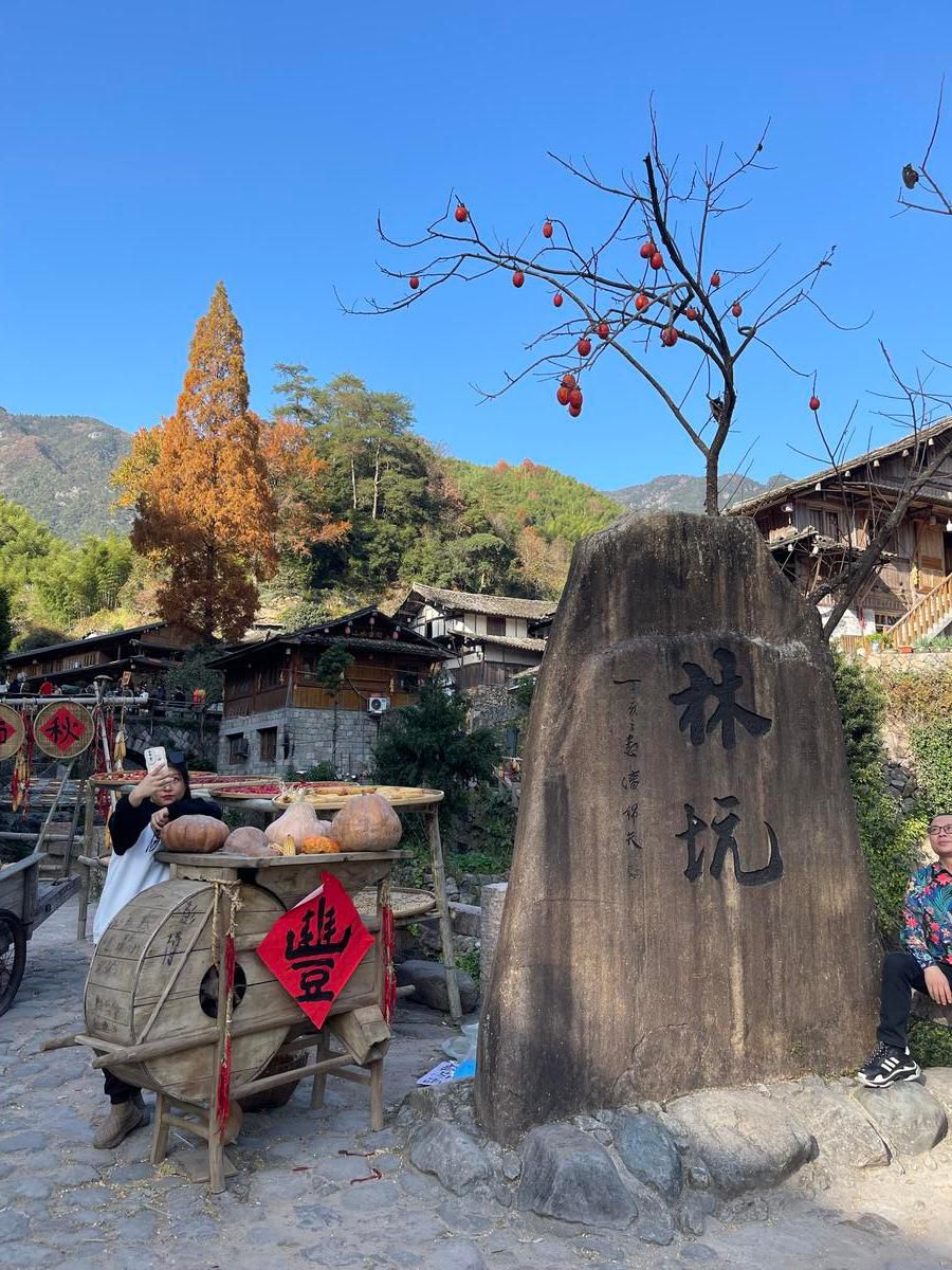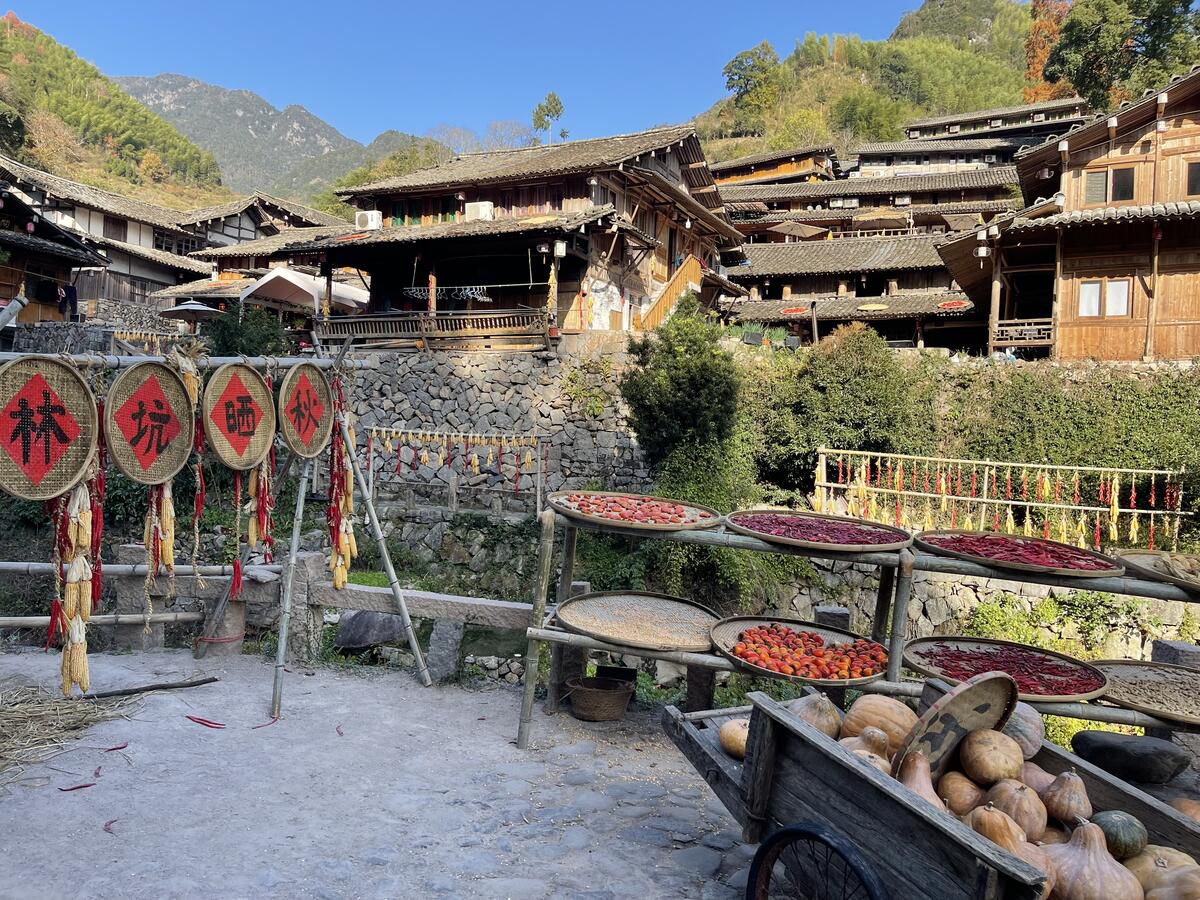 午后时分,阳光和煦。走进永嘉黄南林坑古村,47幢古屋沿山间溪流两岸层层往上,村民们在村口的小道两旁,摆满了农产品土特产,柿子、腊肉、溪鱼干、番薯干、素面、土鸡蛋、黄豆……拼成一幅美丽的丰收画卷。