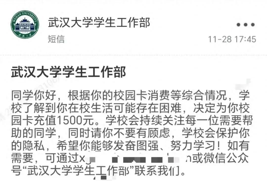 同学你好,根据你的校园卡消费等综合情况,学校了解到你在校生活可能存在困难,决定为你校园卡充值1500元。学校会持续关注每一位需要帮助的同学,同时请你不要有顾虑,学校会保护你的隐私,希望你能够发奋图强、努力学习!