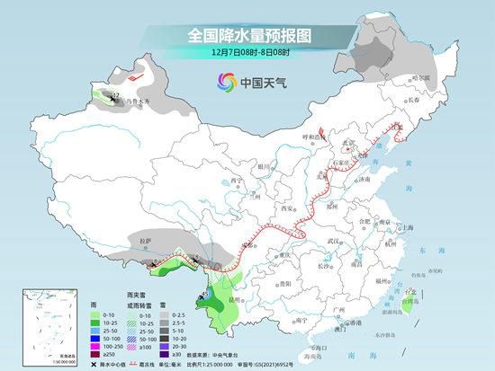 具体来看,中央气象台预计,今天,内蒙古东北部、黑龙江西北部和东部、吉林东部、辽宁东部、新疆北疆北部和北疆东部、西藏东部、川西高原南部、云南西北部等地部分地区有小到中雪或雨夹雪,其中,吉林东部、新疆北疆北部等地局地有大到暴雪。四川南部、云南大部、广西东南部、广东南部、海南岛、台湾岛等地部分地区有小雨,其中,台湾岛东部局地有中雨。