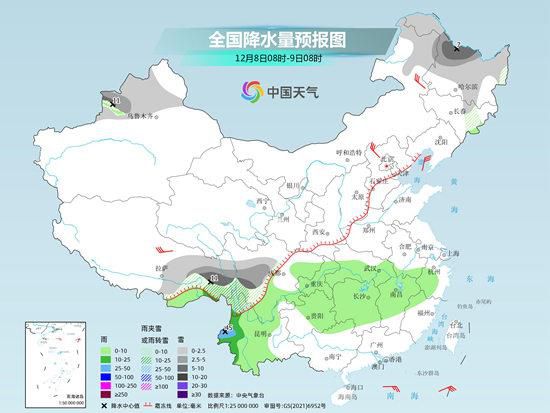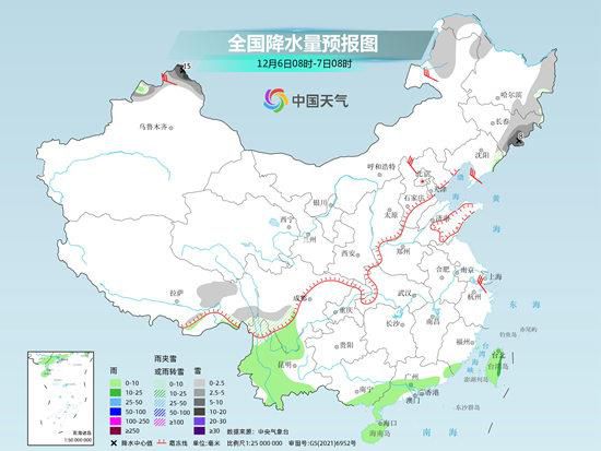 未来三天,我国大部地区仍将维持降水稀少的格局。其中今明天,受冷空气影响,内蒙古东北部、东北地区北部和东部、新疆北疆地区将有小到中雪或雨夹雪,局地大到暴雪;9日起南方的阴雨天气将再度发展增多。