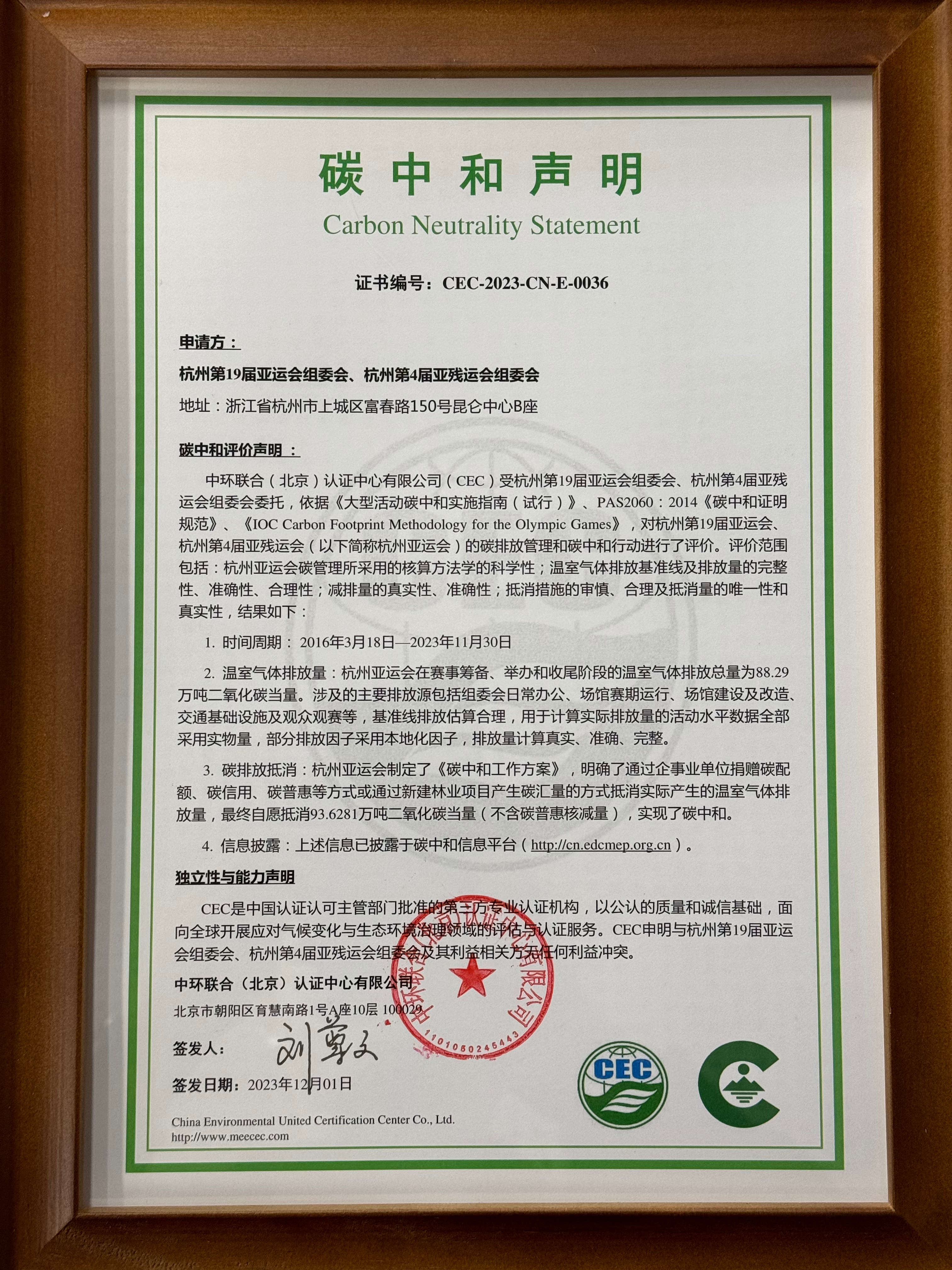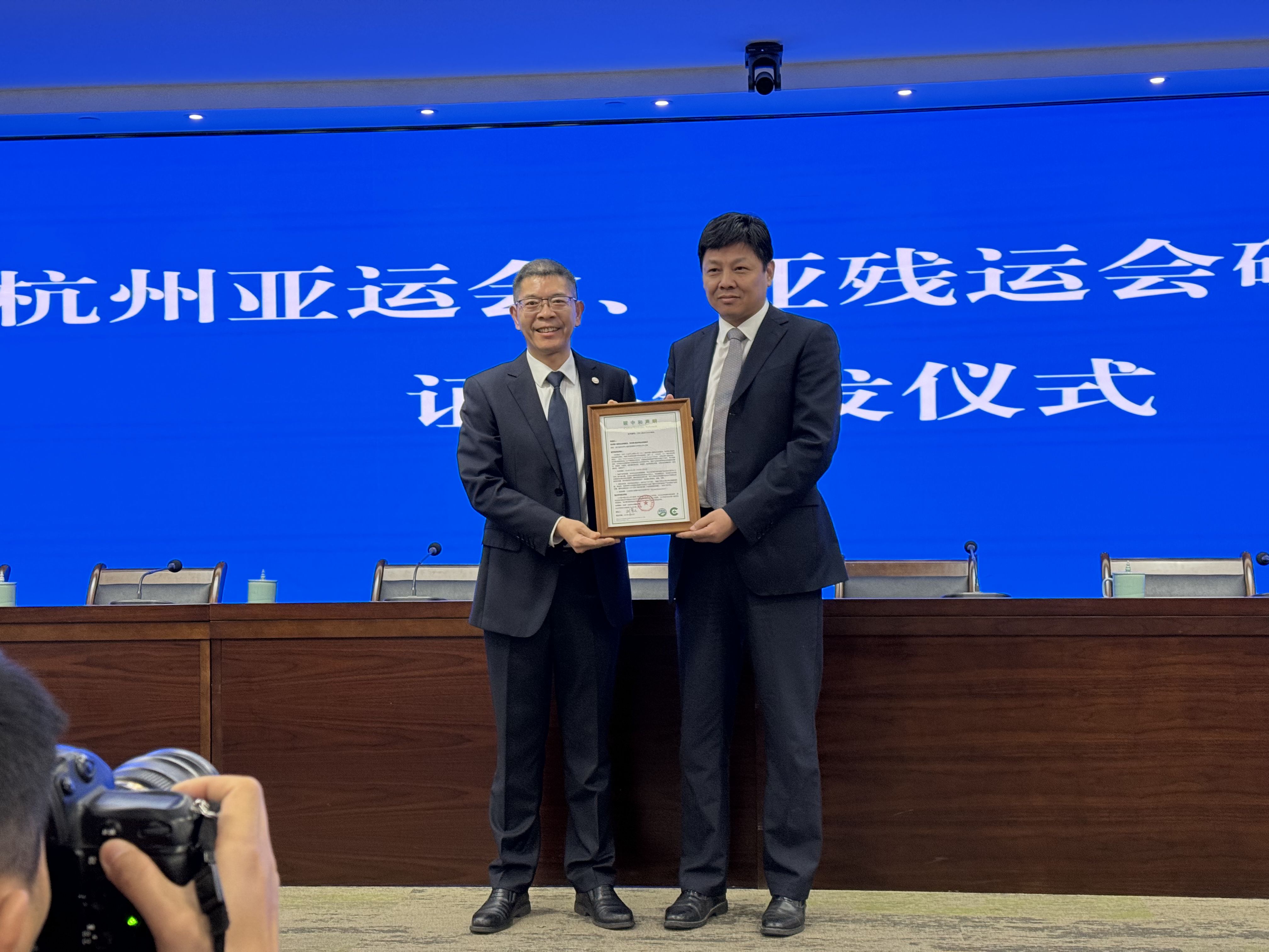 会上,中环联合(北京)认证中心有限公司作为杭州亚运会碳中和评价单位,向杭州亚组委颁发《碳中和证书》,这标志杭州亚运会成为首届实现碳中和的亚运会。