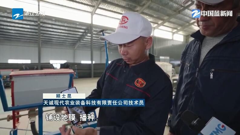 天诚现代农业装备科技有限责任公司技术员 顾士昆:这么一开过去,滴灌带铺设、铺设地膜、播种,还有覆土,一体化全部完成作业了。