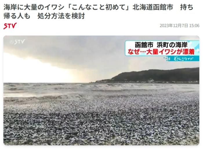 据日本电视台报道,当地时间7日上午,日本北海道函馆市海岸,大量沙丁鱼尸体被冲上沙滩。目前原因不明。